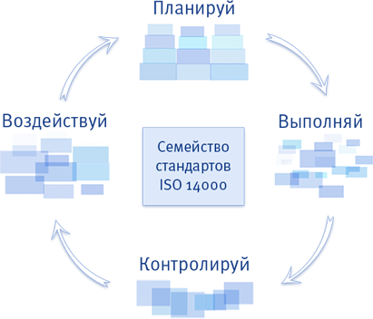 Стандарты серии ISO 14000 разработаны с целью внедрения согласно принципу Планируй-Делай-Контролируй-Воздействуй, который лежит в основе всех стандартов ISO посистемам менеджмента качества.
